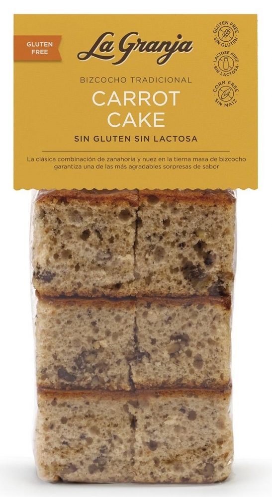 Bizcocho Tradicional Carrot Cake sin gluten, sin lactosa, libre de maíz y sin proteína de vaca. La clásica combinación de zanahoria y nuez en la tierna masa de bizcocho garantiza una de las más agradables sorpresas de sabor.