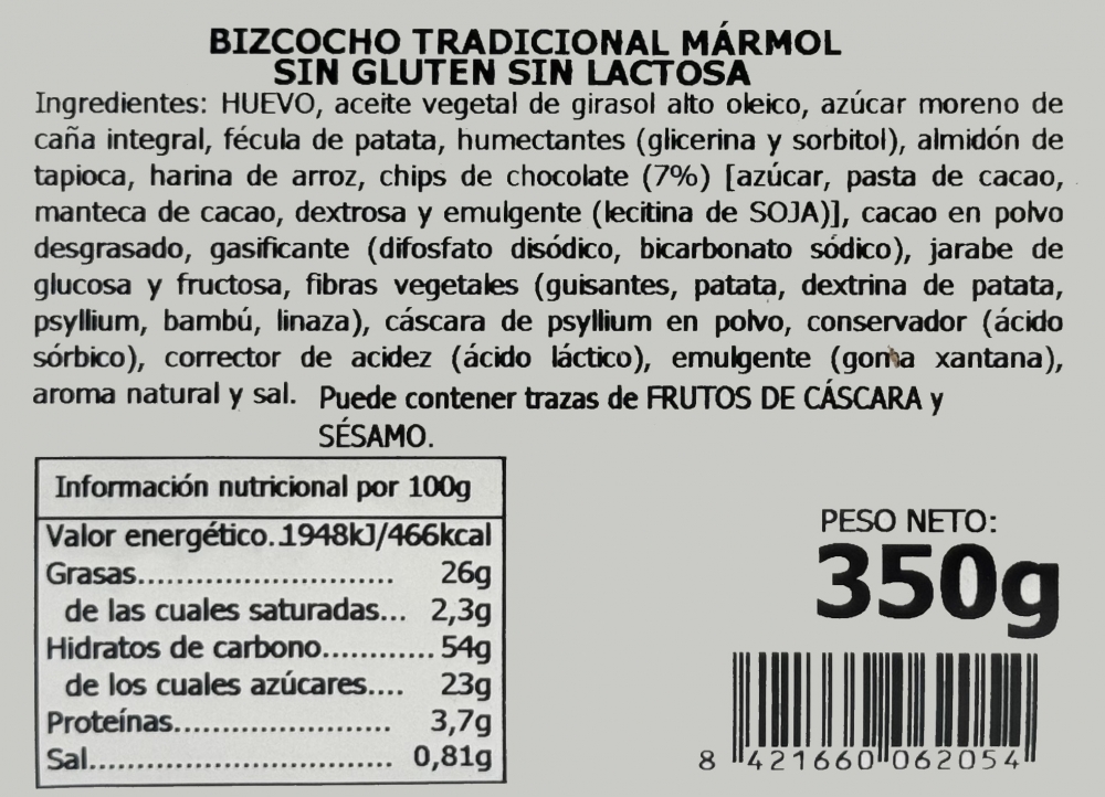 Bizcocho Tradicional Mármol sin gluten, sin lactosa, sin proteína de vaca y sin harina de maíz. Los mejores ingredientes y un preciso horneado nos dan un tierno y tentador bizcocho mármol con pepitas de chocolate.