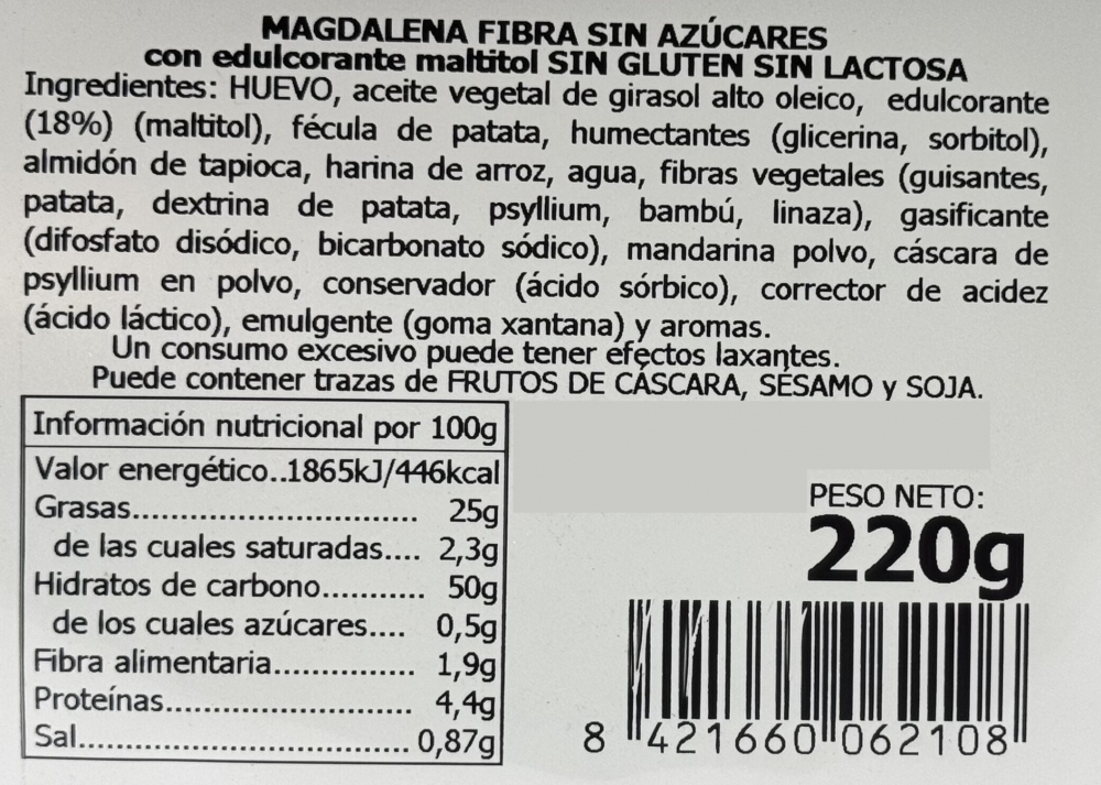 Magdalenas Fibra Sin Azúcares con edulcorante maltitol, sin gluten, sin lactosa, sin proteína de leche de vaca y sin harina de maíz. Con diferentes fibras y un preciso horneado dan a estas magdalenas todo el sabor y esponjosa textura.