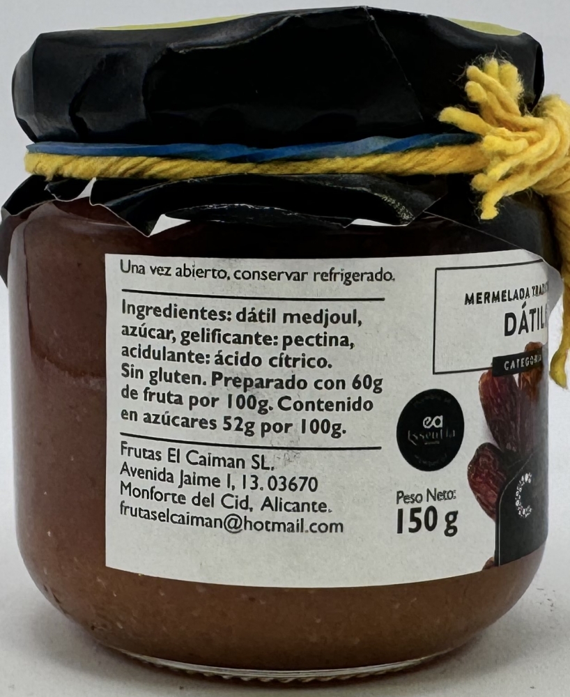 “El dátil cuenta con siglos de historia. Con origen en la antigua Mesopotamia, llegó a los Fenicios, quienes la trajeron a nuestra tierra. Desde entonces hasta la actualidad, el Dátil se valora tanto como un energético alimento, así como complemento medicinal dadas sus tantas y variadas propiedades para la salud. Nuestra Mermelada Tradicional de Dátiles, elaborada con el cuidado de lo artesanal, desde lo más simple a lo más sofisticado aporta un sinfín de opciones a tus elaboraciones.”